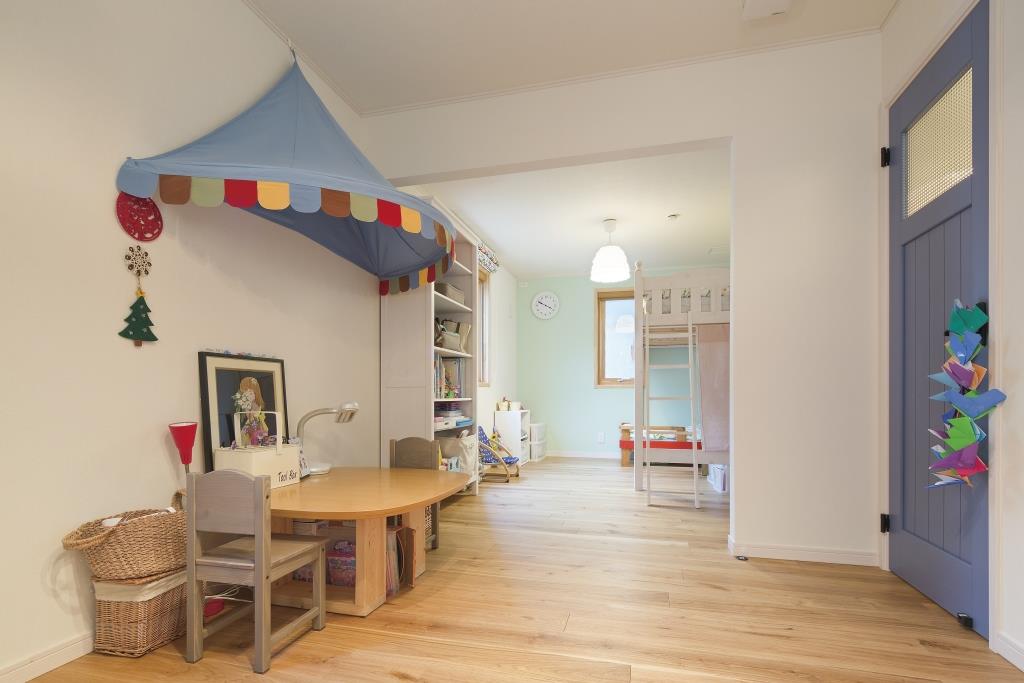 無垢の木を多用した室内ドアや家具、キッチン