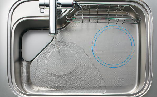 クリナップ社オリジナルのシンク形状である”流レールシンク”