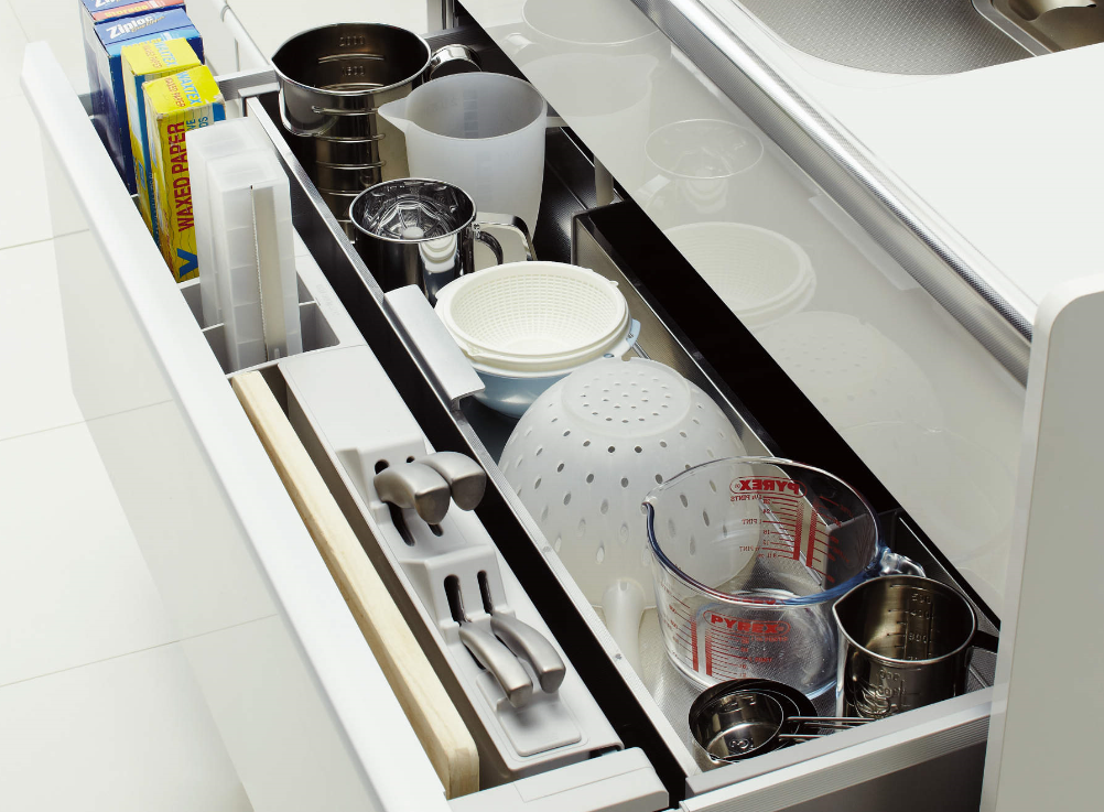 上棚が設定されていたり、またこの上棚や包丁専用の収納部が引出の開閉と