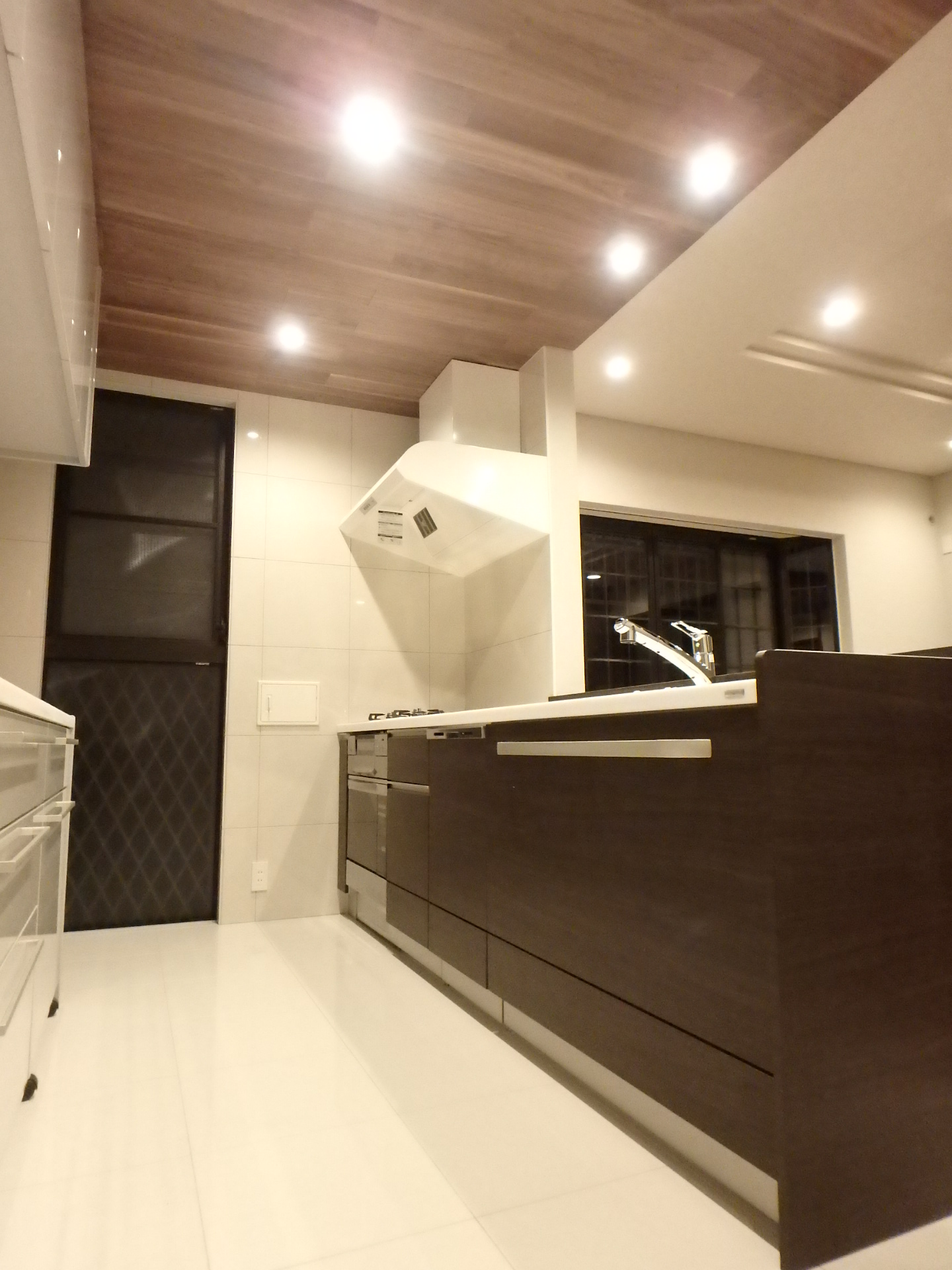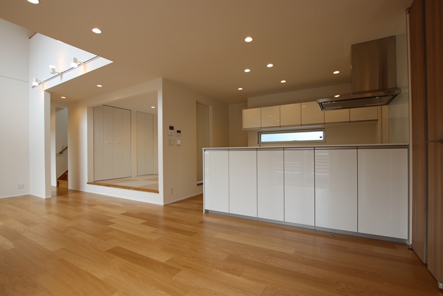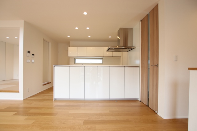 落ち着いた[オーク]の銘木フローリングに、ホワイトの鏡面が美しいシステムキッチン!!