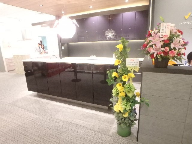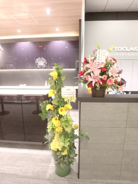 リフォームイベントを共催する2社より送られた[祝花]が並んでお出迎え!!