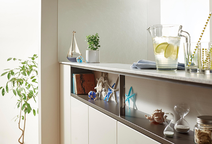ワークトップカウンターからシームレスでキッチン正面に立ち上がる人造大理石の