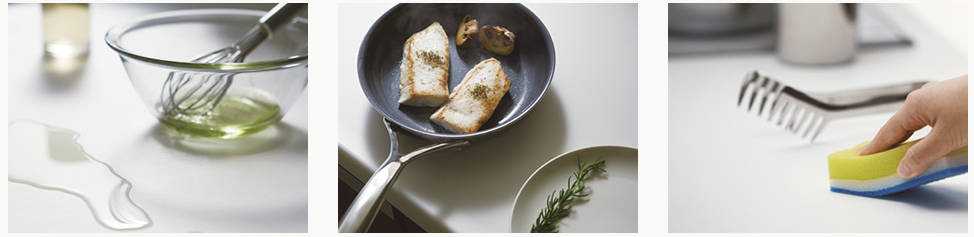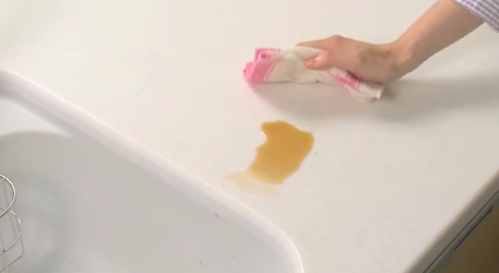 トクラスが自社開発した高性能人造大理石の大きな特徴でもある”お手入れカンタンいつもキレイ”