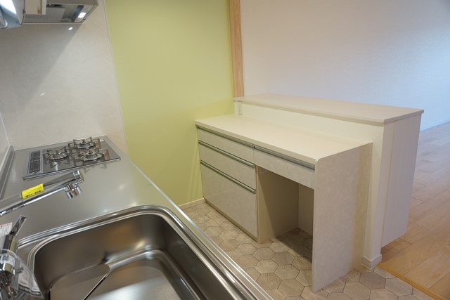敢えてキッチンの配置位置は変更せずに、作業用スペースと収納を兼ねるカップボード(食器棚)