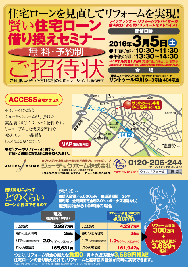 3月5日(土)限定 “無料”住宅ローン借り換えセミナー・マンションリフォーム完成内覧会”同時開催します!!