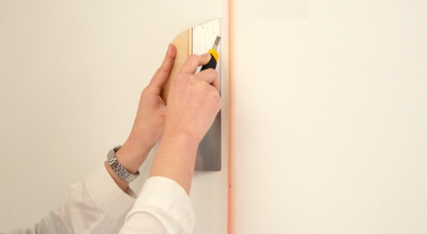 クロスの継ぎ目や角(隅)に下地に傷がつかない様に優しくカッターを入れ
