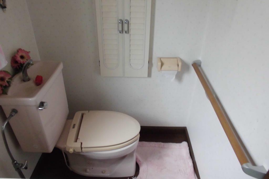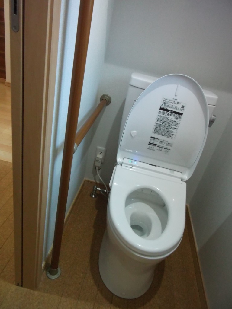 コチラのトイレには、正面にヨコのI型の丸棒手すりを設置。