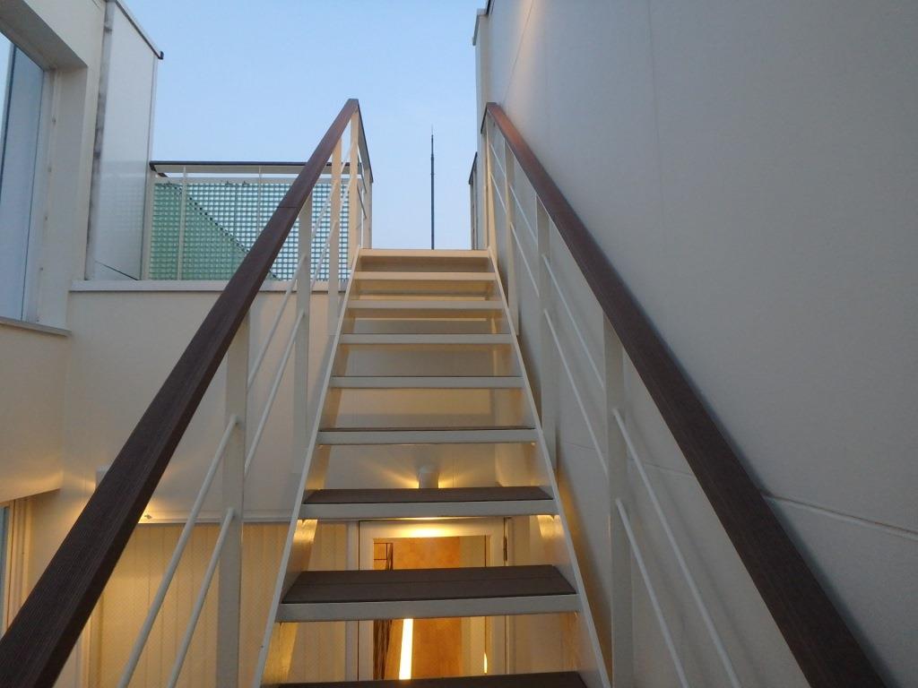屋上のウッドデッキへあがる階段の[踏み板]も同じ人工木で作製!!