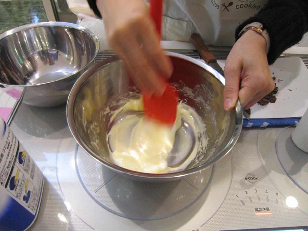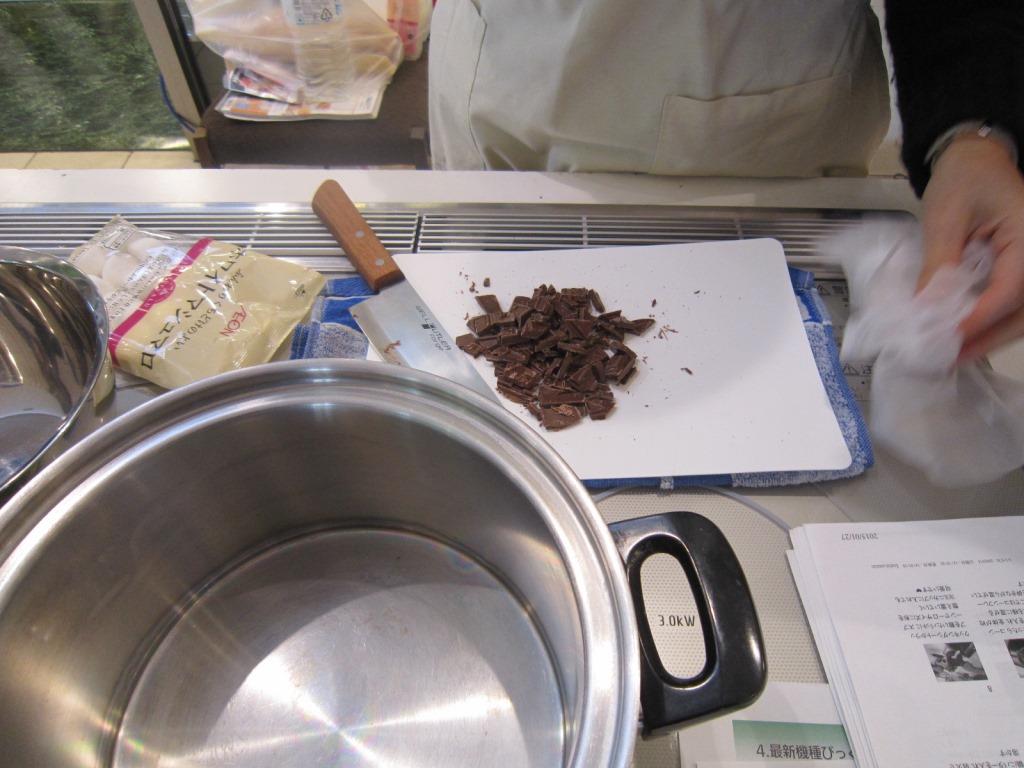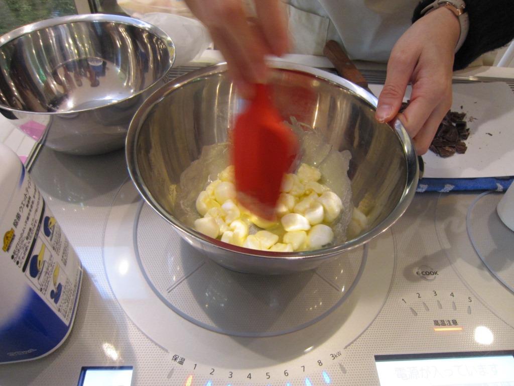 3. 完全に溶けた状態になったら、1の小さく刻んだ板チョコを混ぜ合わせ