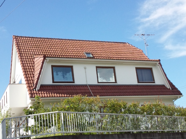 ”真っ白”に塗り直した外壁の左官が、『赤い瓦の大屋根』と『木製サッシ』をさらに