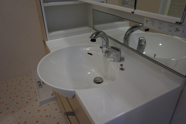 ミラーキャビネットと洗面台の間に、小さなお子様の洗顔や歯磨きで大活躍の