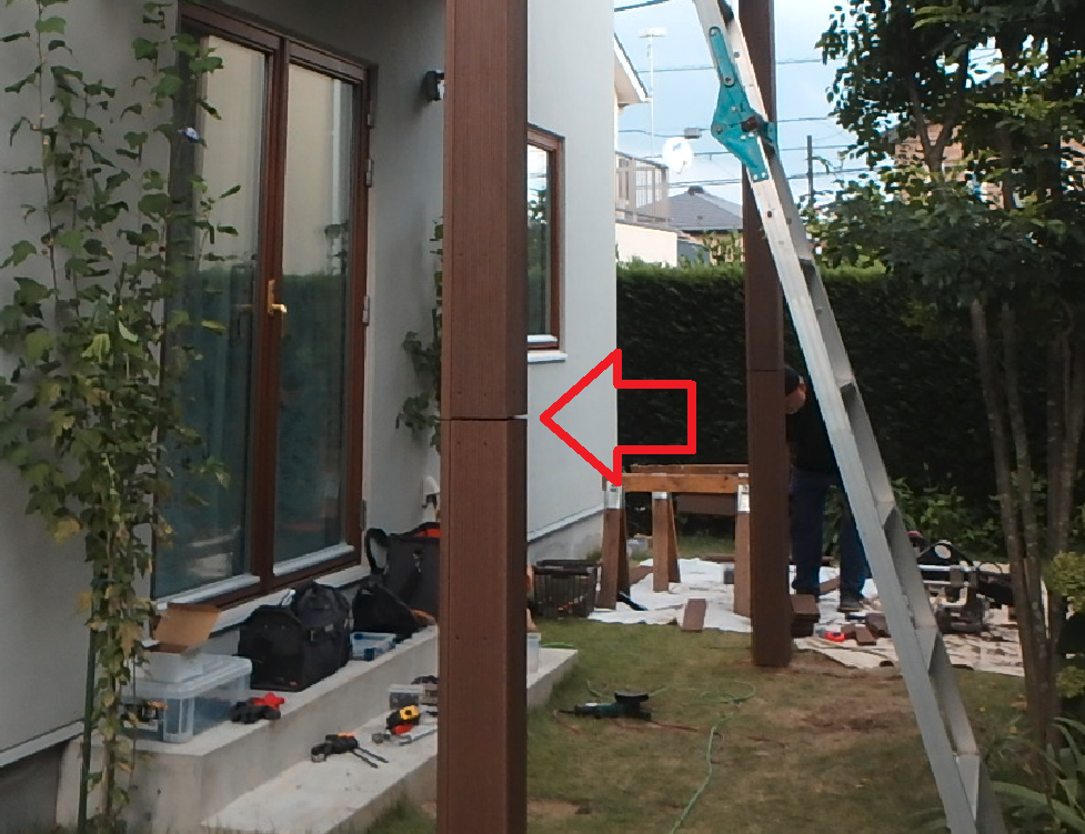 [鉄骨製の柱]にも綺麗に、ハイブリッド(人工木デッキ)が化粧されて