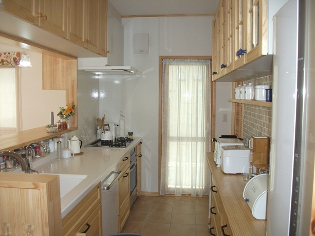コチラは無垢の木のオークの扉とタイルのカウンターが美しい