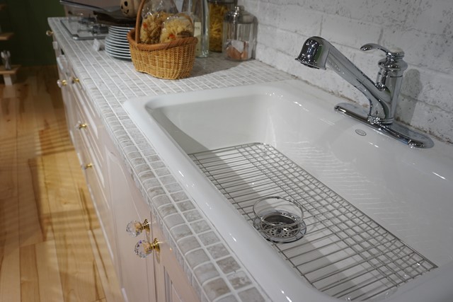 タイル仕上げのワークトップに大き目の四角いシンクは[琺瑯(ホーロー)製]