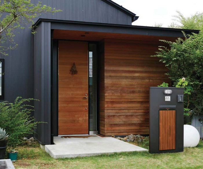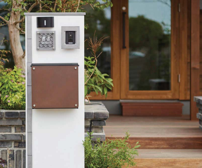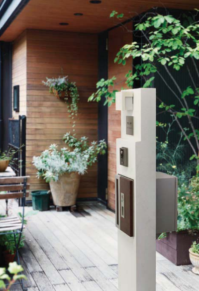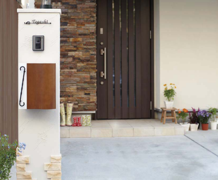 こちらの門柱は、お住まいで近年人気の木製サイディングやタイルに合わせた