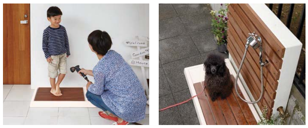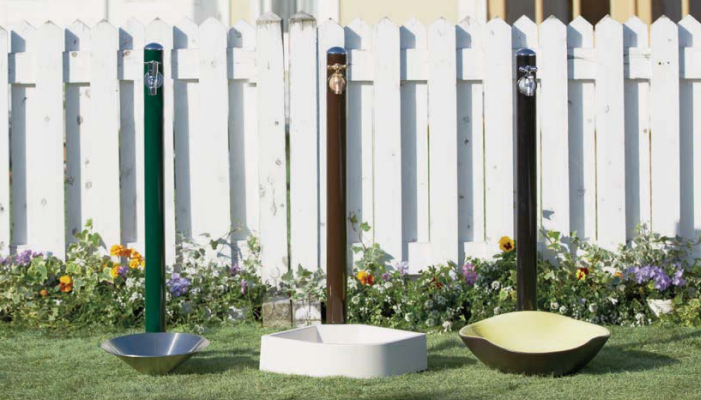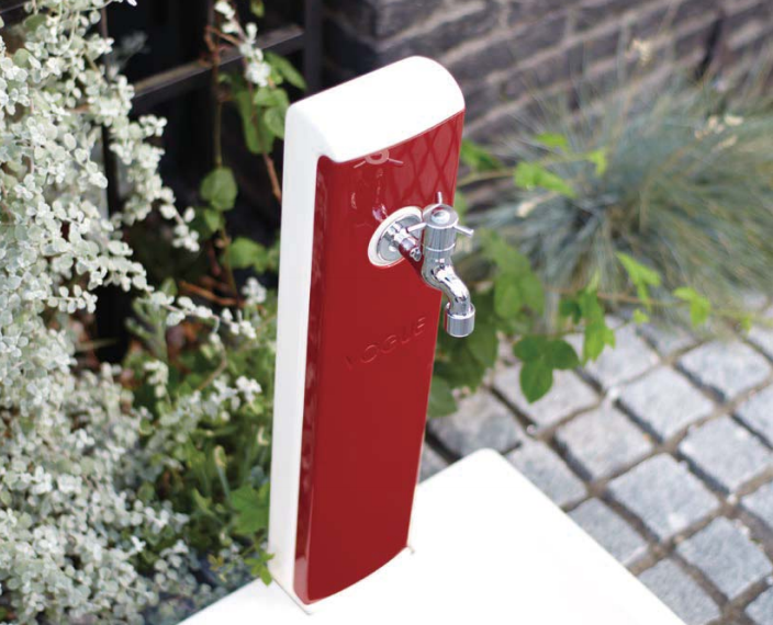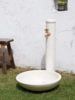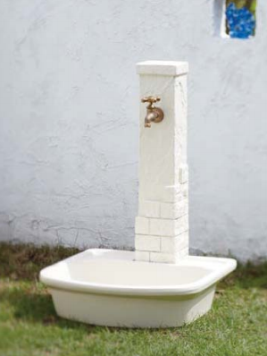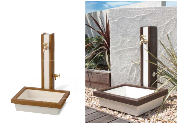 テラコッタ風デザインの立水栓は、上部に植栽ポットをそのままいれられるデザイン