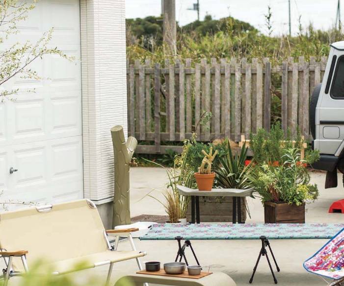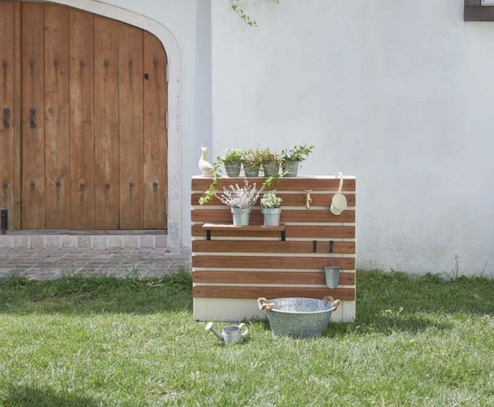 オプションで用意されたトレイやフックを利用して、おしゃれな鉢植えやスコップ