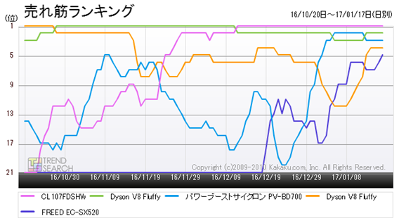 なんと折れ線の薄緑色のDyson(ダイソン)社製の名作である[V8シリーズ]を上回る人気!!