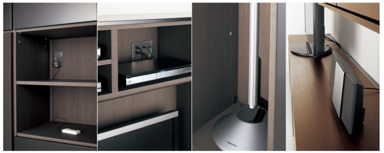 TVスペースの下部には、敢えて中が見えるガラス扉を使用したAV機器スペースを