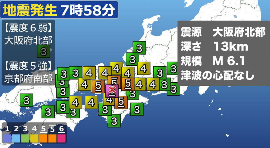 最大震度6弱(大阪府北部)の大き目の地震が発生(汗)