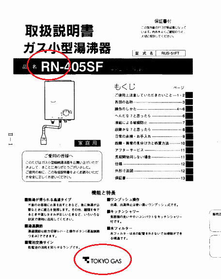 コチラは東京ガス社製のガス給湯器の取扱説明書。