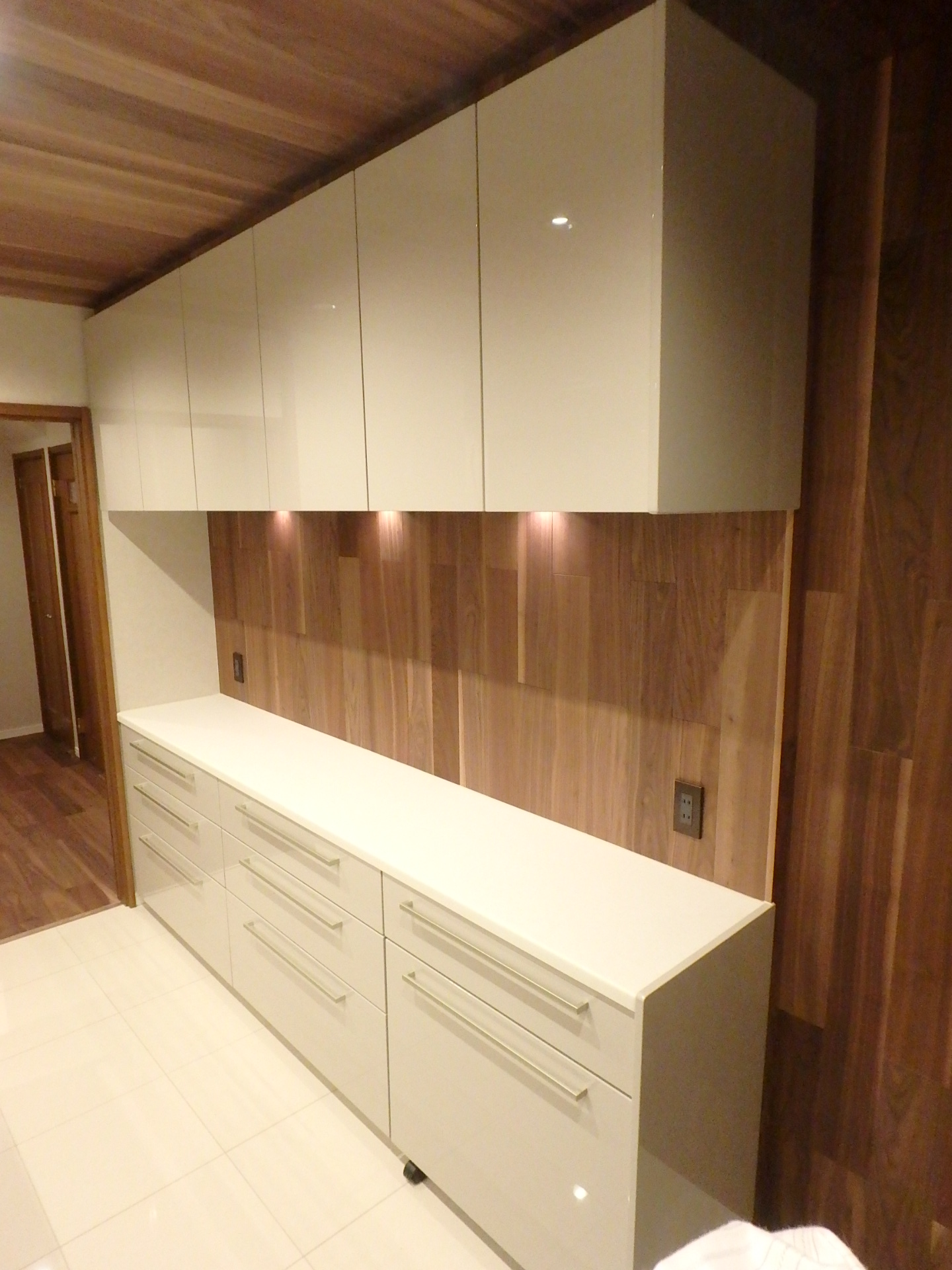 2列型に配置されたキッチンの背後のカップボード(食器棚)兼作業スペースのカウンター