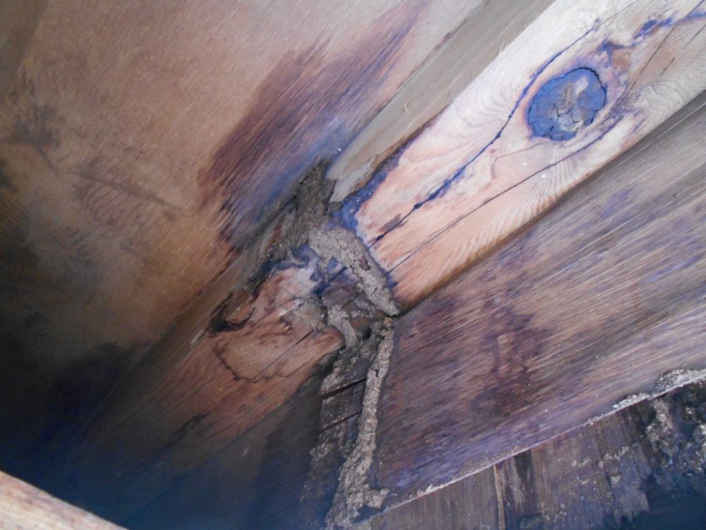 雨漏れで常に湿った状態の「構造床の木」に、シロアリが発生していた跡(蟻道(ぎどう))