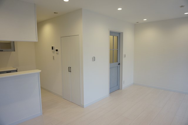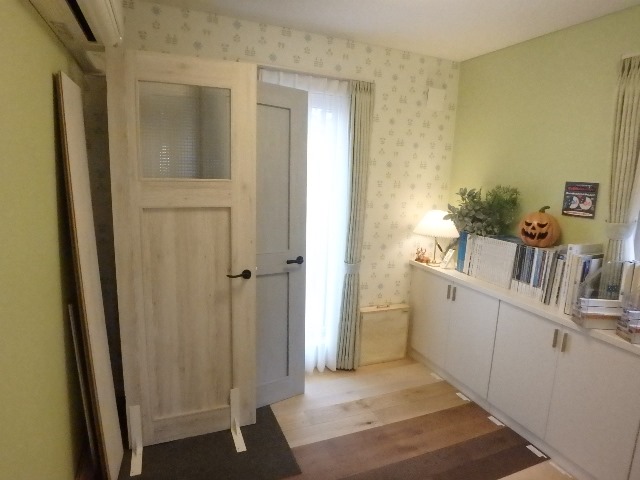 変わって、隣りの部屋には、同じ白い木目柄の樹脂製のラミーネートが施された最新の「扉」や