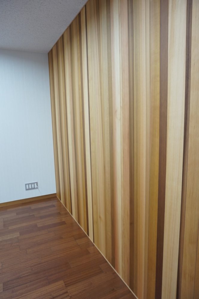 建築資材商社らしく!?一面の壁には天然木無垢と突板のキレイなウォール材!!