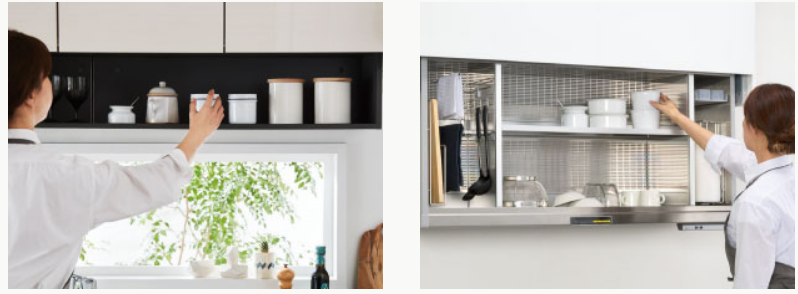 メーカーには逆転の発想から生まれた跳ね上げ式の吊戸の扉は、名門キッチンメーカー