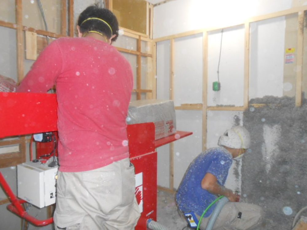 このセルローズファイバー断熱工事のメリットのもう一つは、リフォーム現場で吹付け工事を
