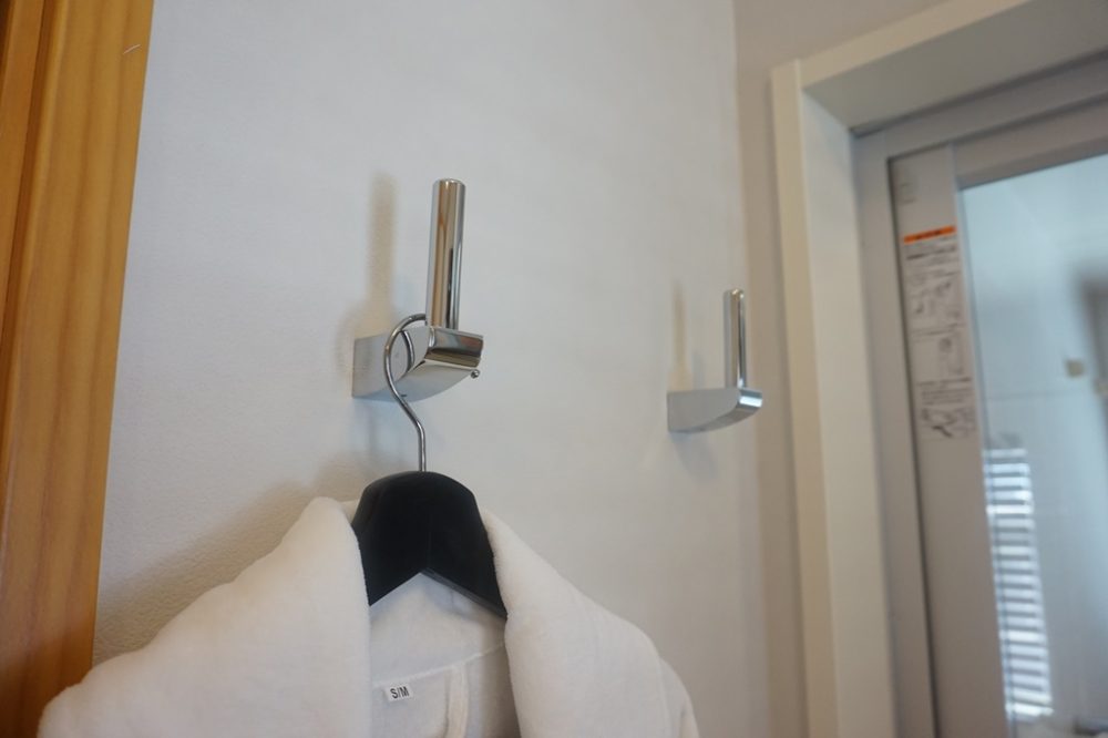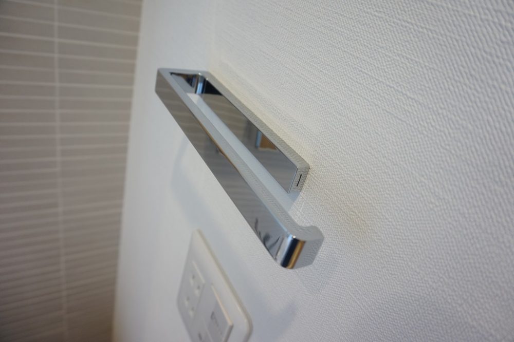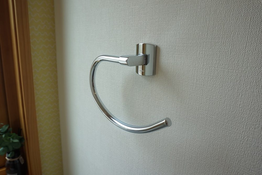 コチラの洗面室のタオル掛けの金物も個人的に好きなデザイン!