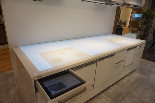 展示キッチンのキャビネットは、クリナップが採用している食器洗浄乾燥機が並ぶ