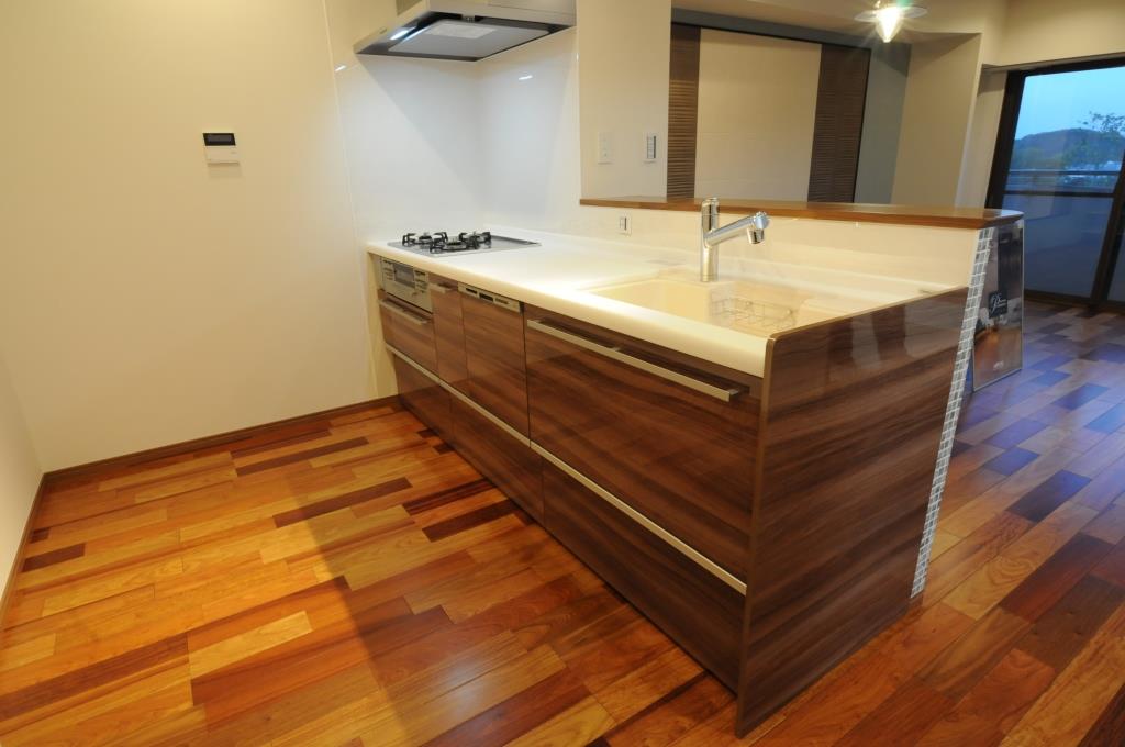 この大開口のプランは、対面式キッチンだけでなく壁に向いているキッチン