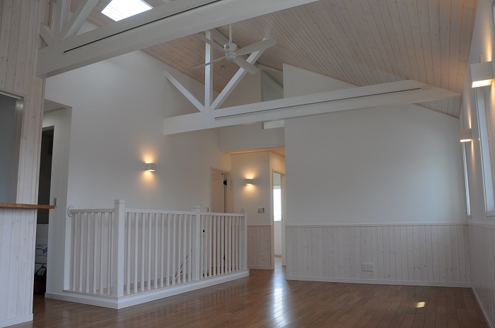 インテリア全体を見渡しても、屋根(天井)を支える米マツ材の梁材だけでなく