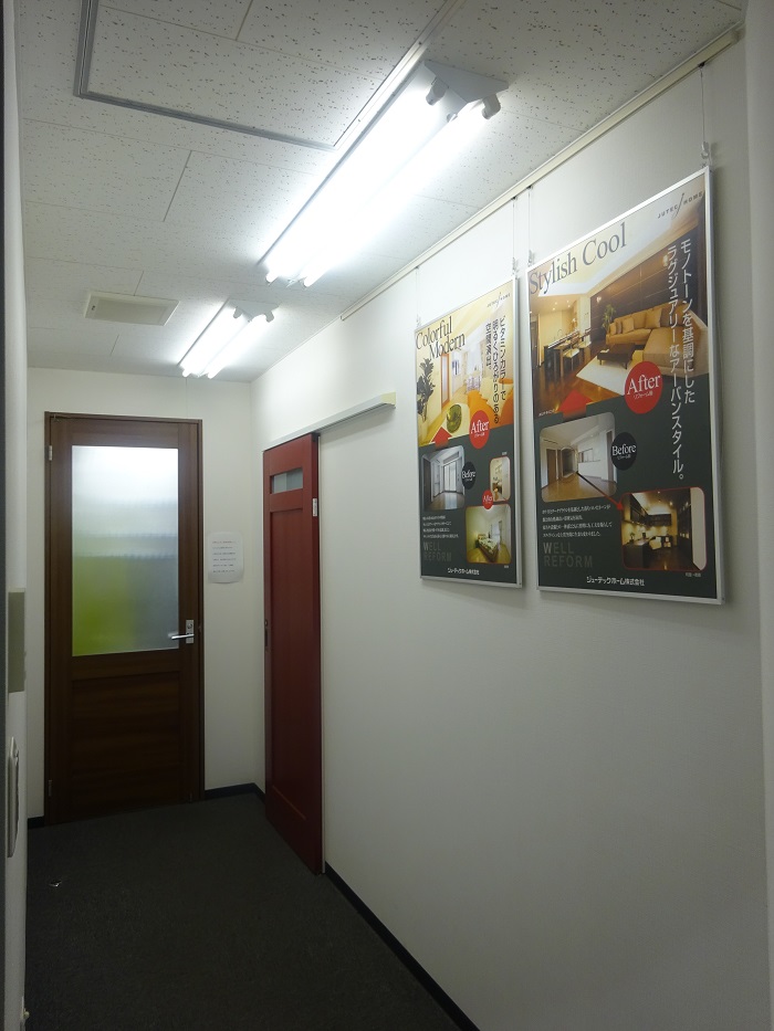 リフォームセクションのオフィスに続く廊下の壁に、ウェルリフォームの