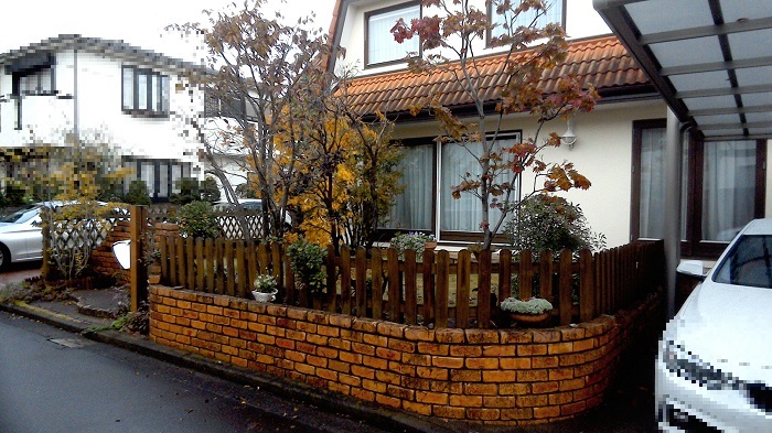 上述したビフォー(リフォーム前)の天然木無垢のフェンスは、北欧ブリックの上に