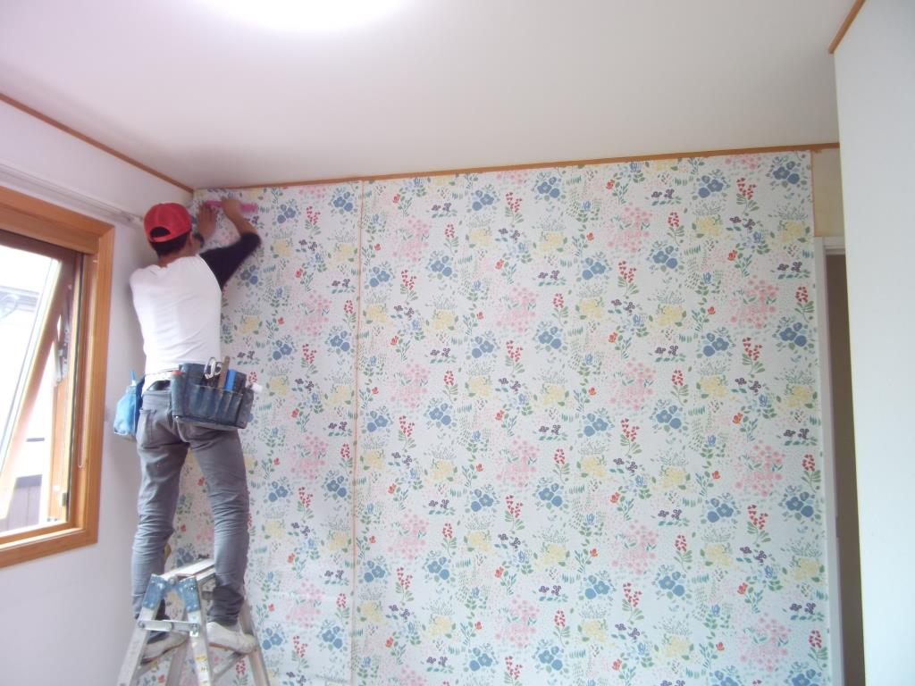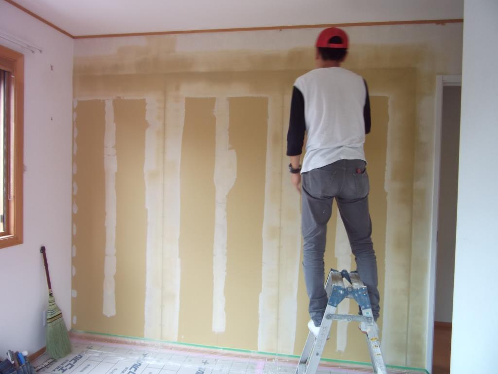 クロス工事屋さんにより、パテからクロス貼りへ
