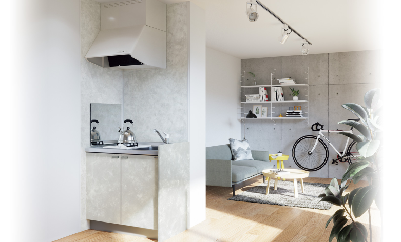 一般的な賃貸案件向けのスタンダードデザインのコンパクトキッチンと違い、