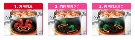 「鍋底を自動で分割加熱」する事により、かきまぜ効果のある交互対流をおこします!!