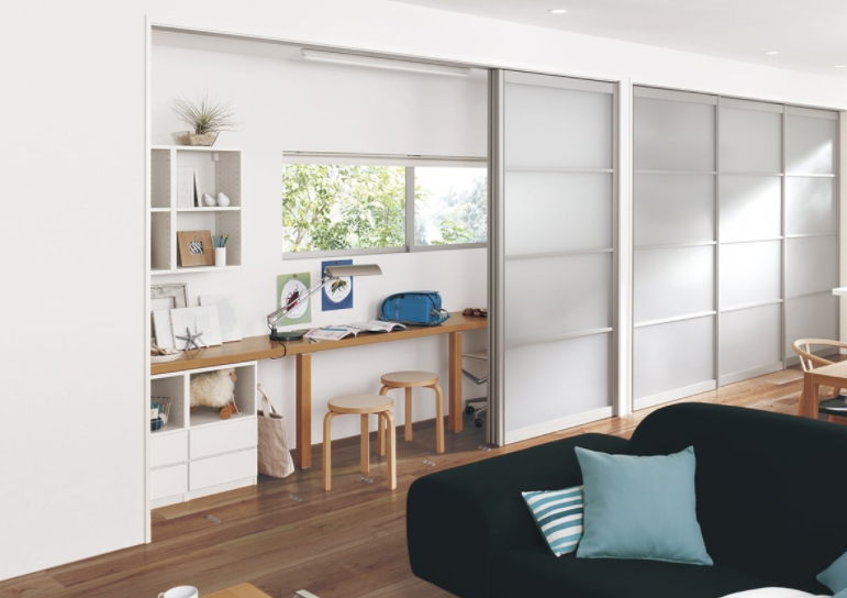 半透明ガラス戸を使用して、リビングルームの一角に造るテレワーク
