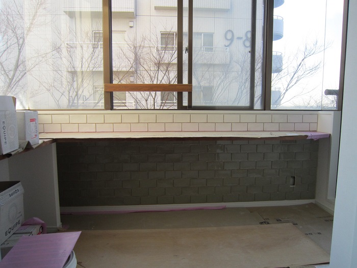 設置されるカウンター板は、コンクリートの壁に設置された何本もの