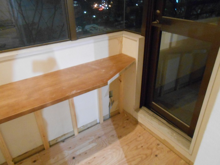 壁に新たに設置されたテレワーク用の天然木無垢の集成カウンター