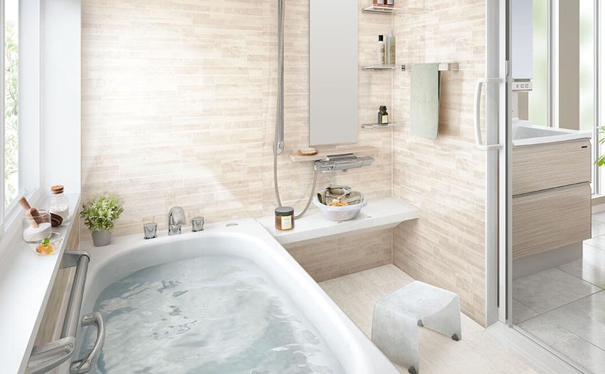 浴槽だけでなく、面積の広い壁も毎日のお掃除は簡単にシャワーで