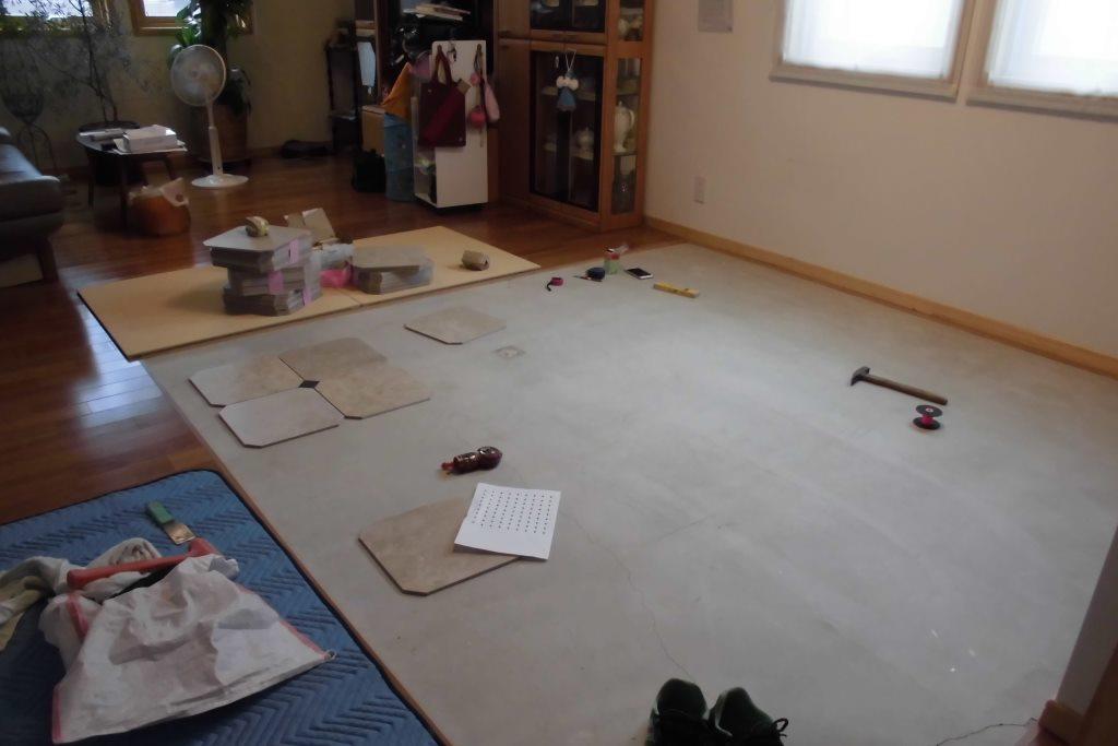 床に仮置きされているタイルをご覧ください!!
