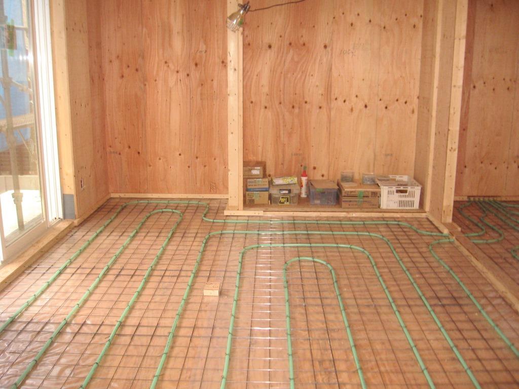 フロア全面にシームレスで設置された温水パイプ。
