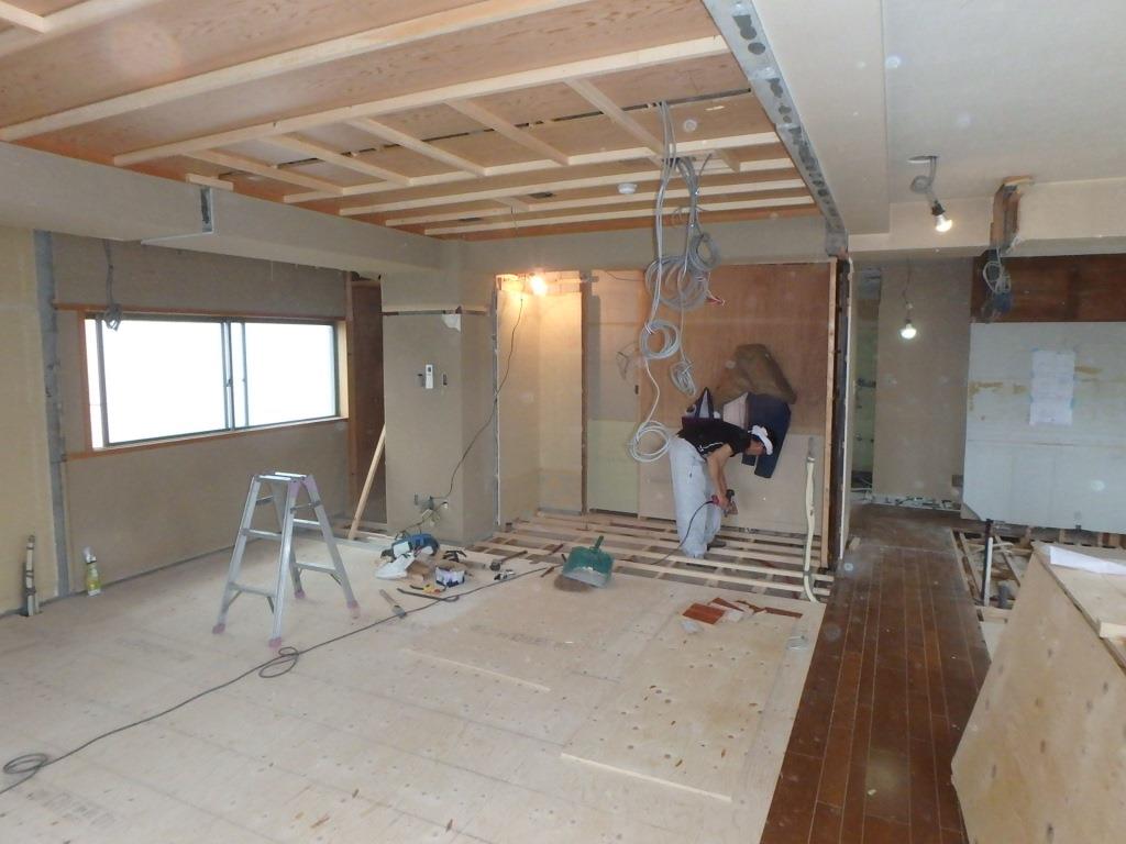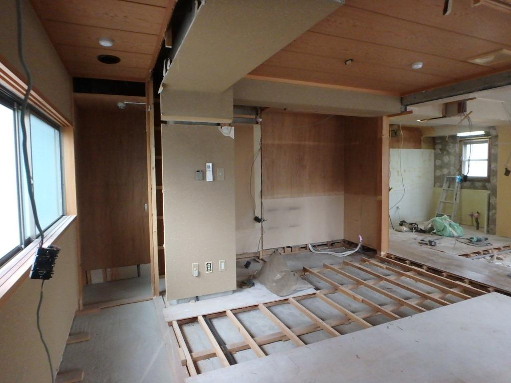 部屋は、新しく床の下地が施工されて行きます。