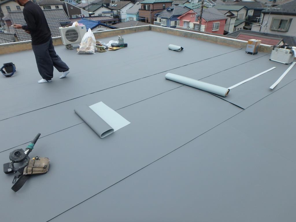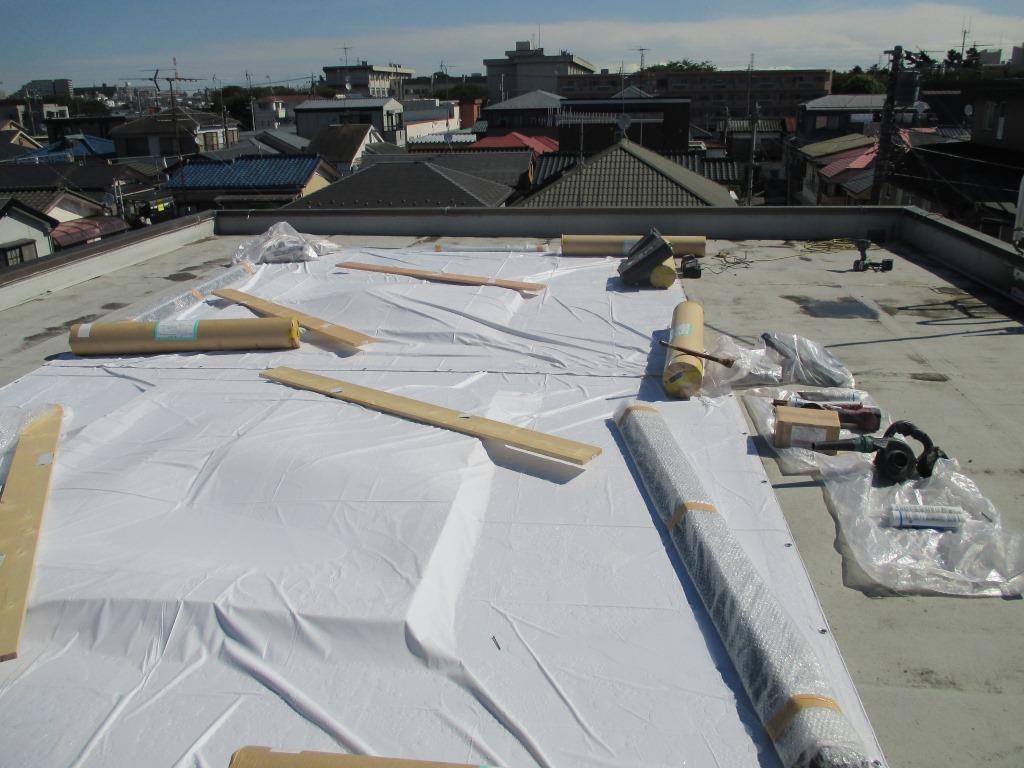 まずは1重目の防水シート貼り!! 写真では見にくいですがシートとシートの