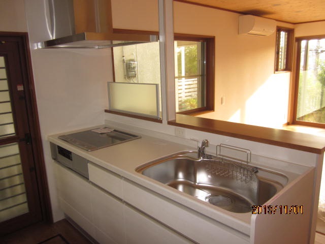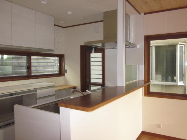 キッチンの<扉>と<同面材>の<キッチン家具>も設置し、<見た目>だでなく