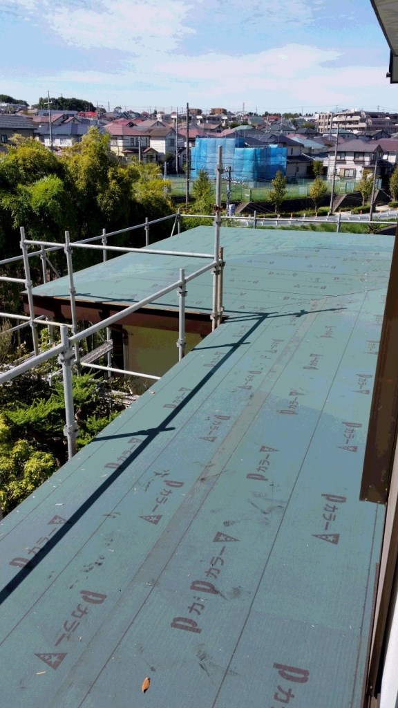 新たに設置した屋根組に貼られた「防水アスファルトルーフィング」